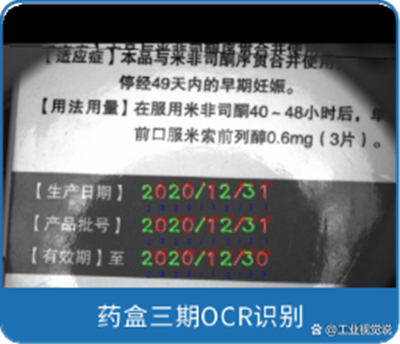 机器视觉中的OCR识别技术,就能很好完成这个缺陷检测的功能,现已广泛应用中医药、食品、日化、化工等行业中,对标签打码、外箱喷码、瓶子喷码等标识的检测,有效避免了消费者对厂家品牌形象的不良影响。